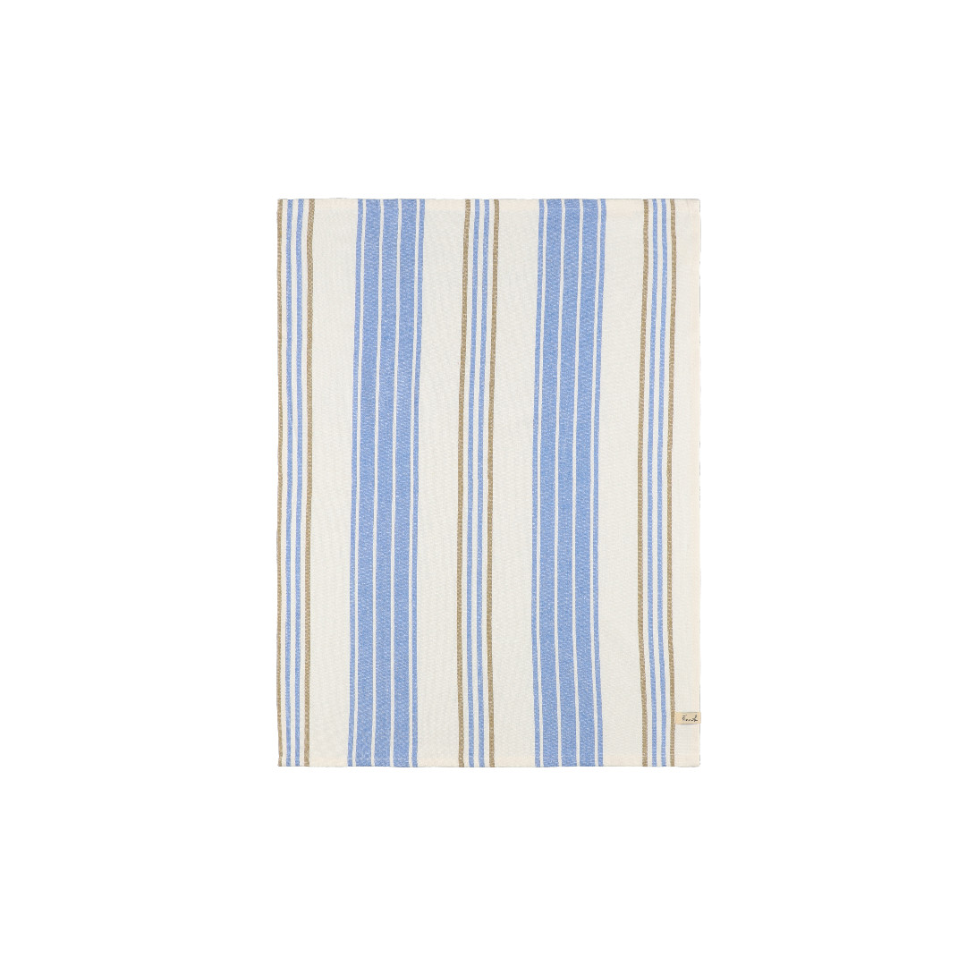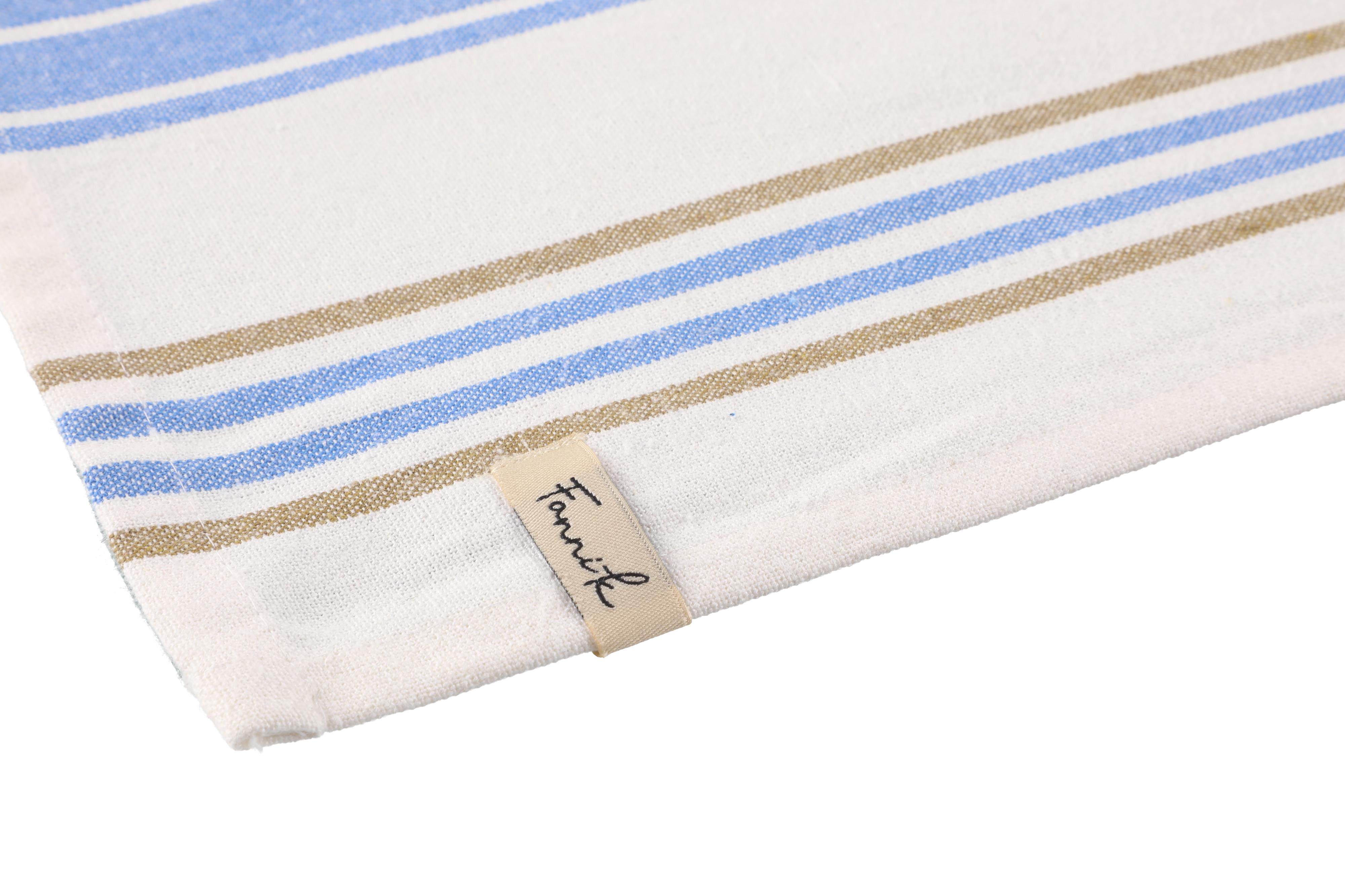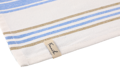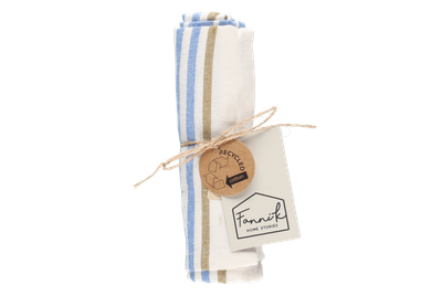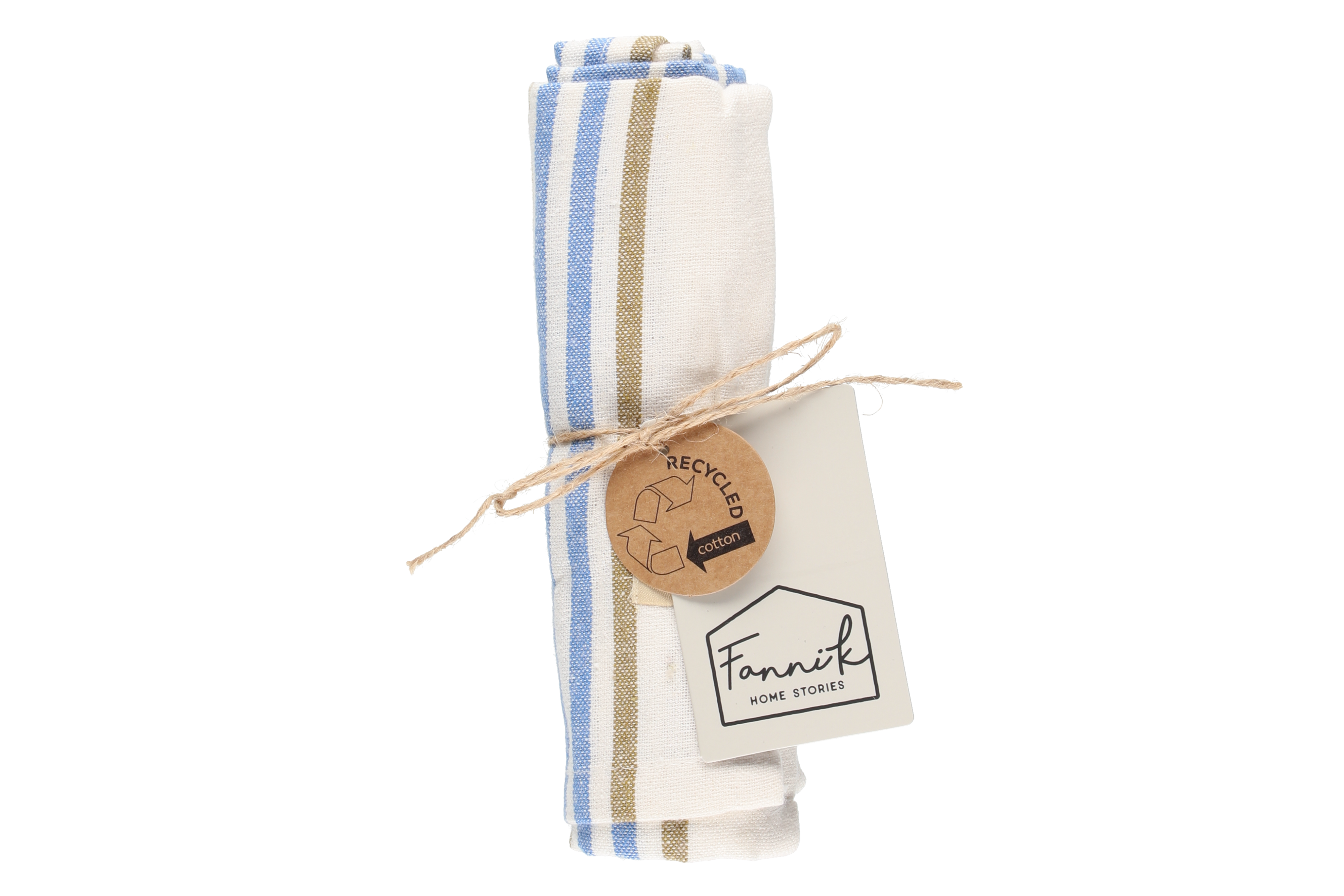 Kierrätyspuuvillasta valmistettu raidallinen keittiöpyyhe.