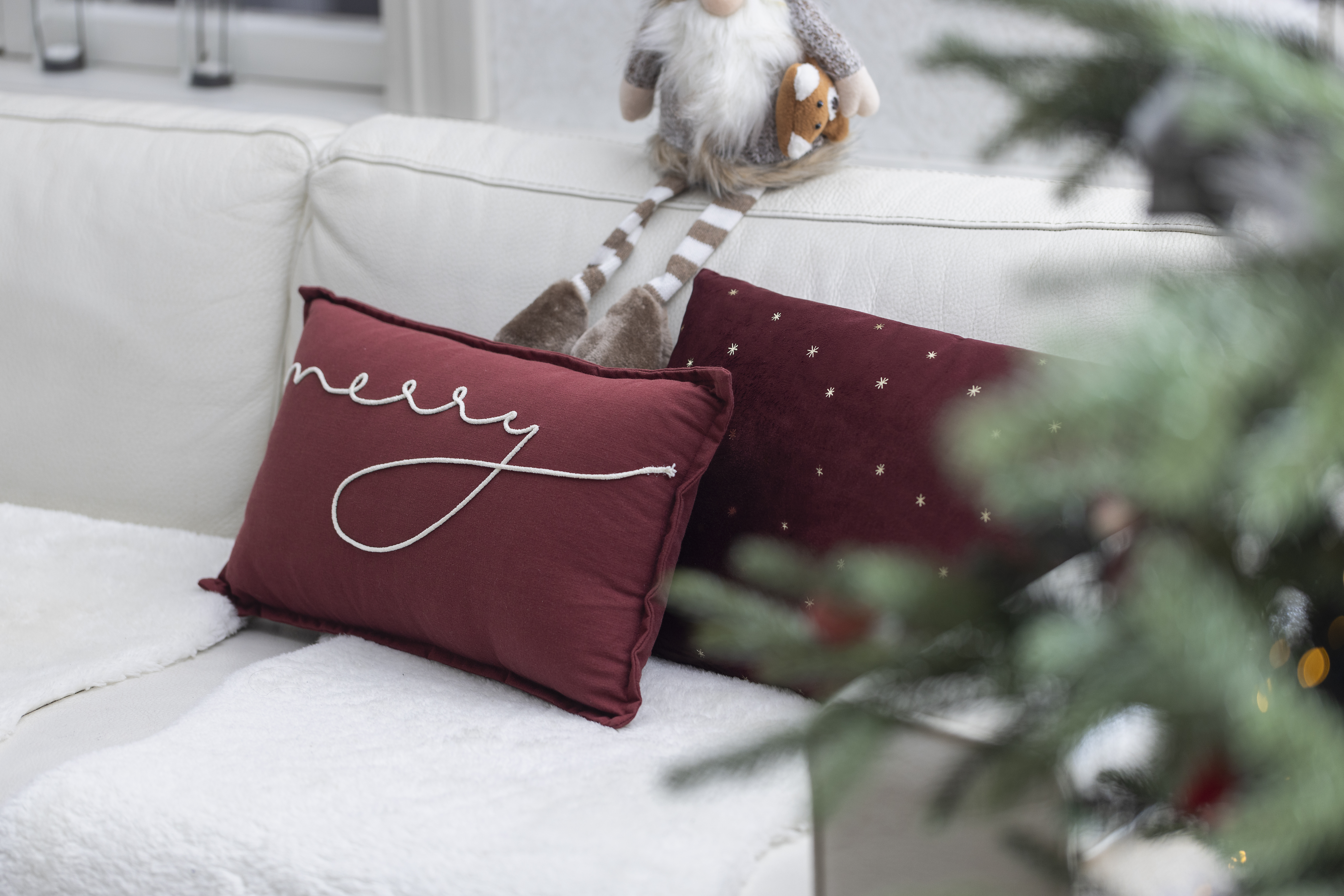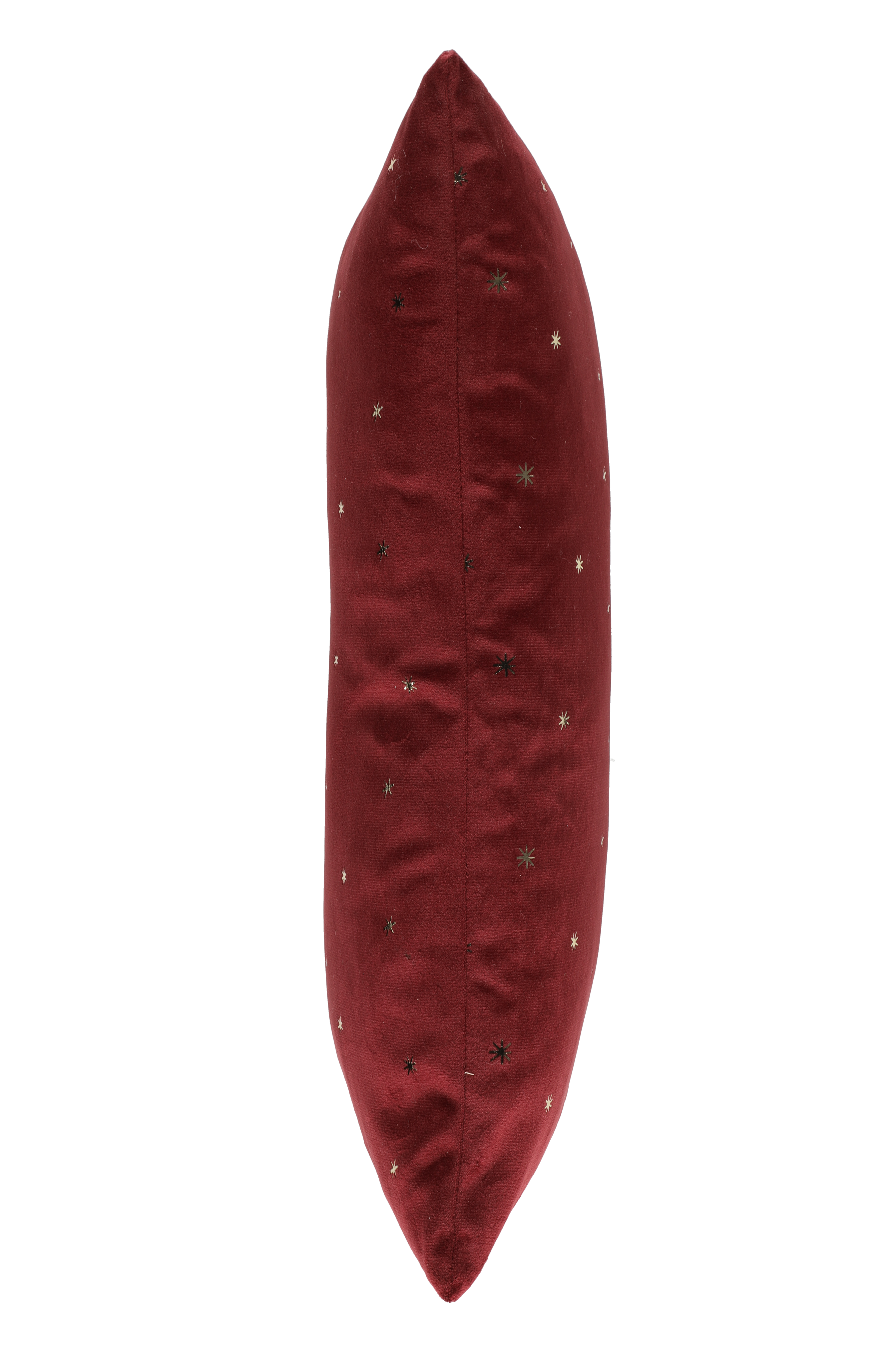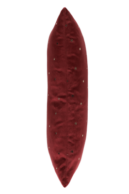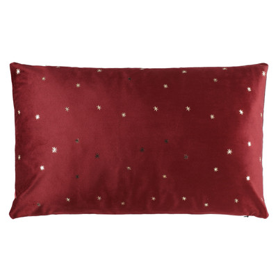 Suorakaiteen muotoinen punainen samettityyny, jossa on kullanvärisellä foliopainatuksella pieniä tähti/lumihiutalekuvioita. Irrotettava päällinen.