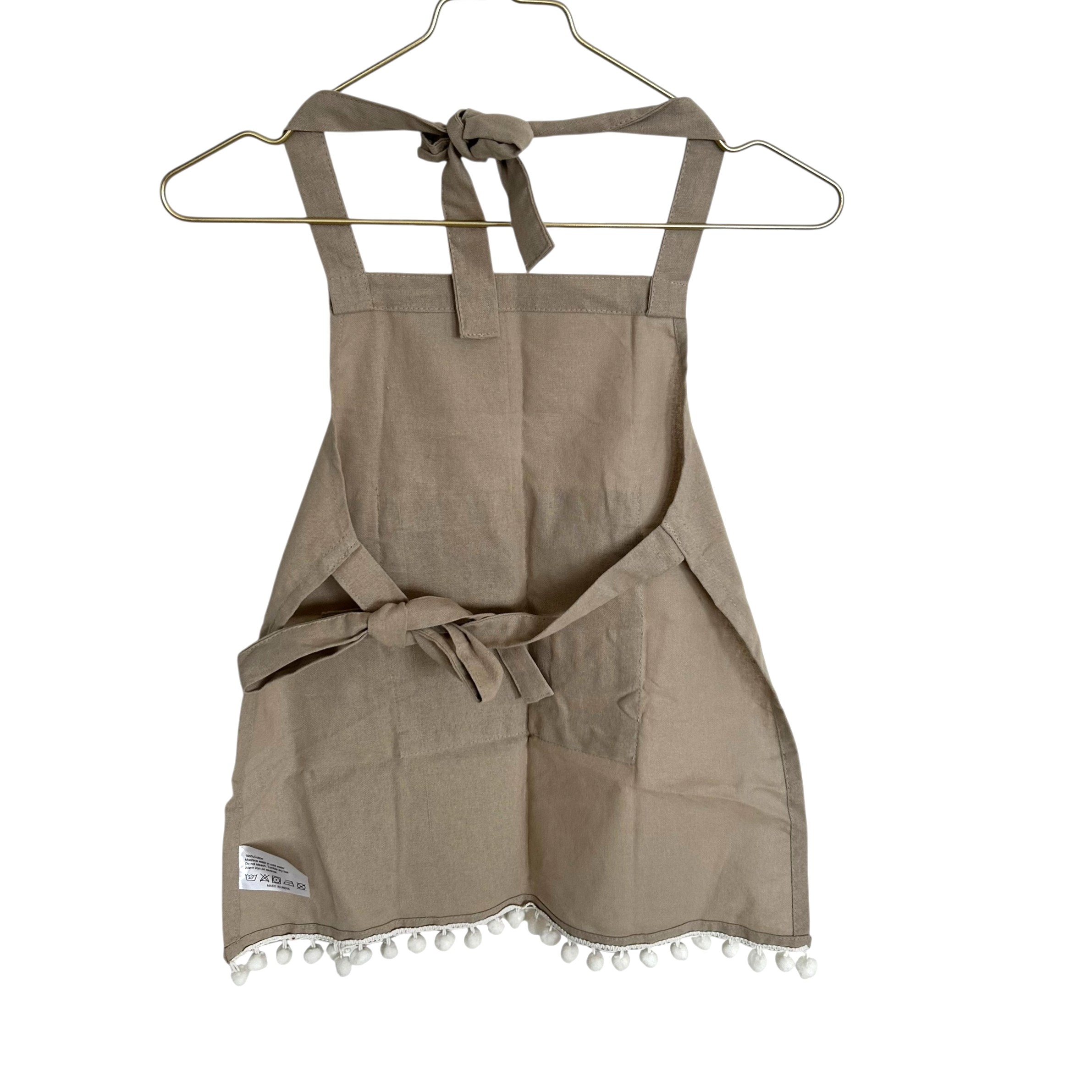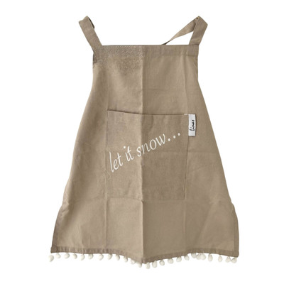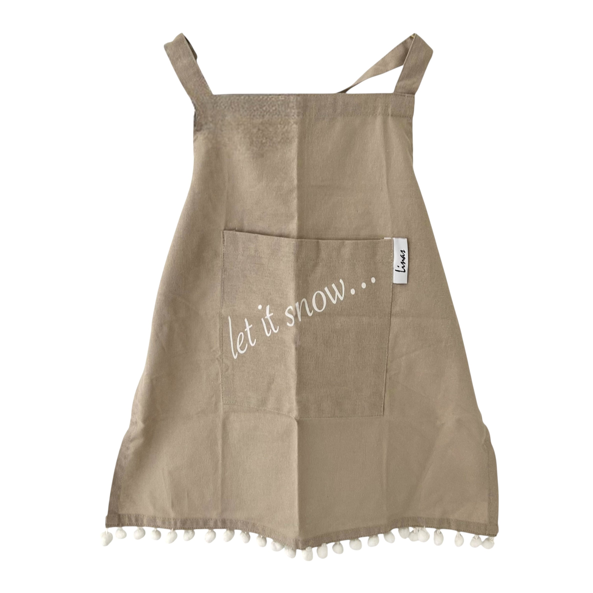 Beigenvärinen lasten esiliina, jonka etutaskussa lukee 'let it snow...'. Esiliinan alareunaa koristavat valkoiset 'lumipallo-pampulat'.
