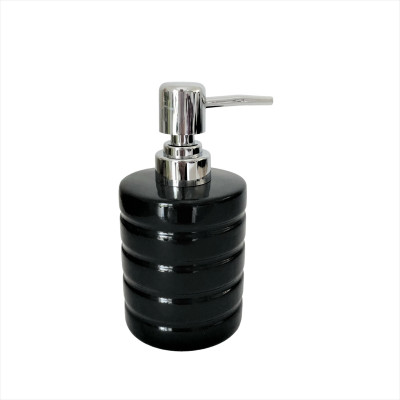 Tyylikäs musta keraaminen saippuapumppu, jossa hopeanvärinen pumppuosa. Pullossa on raitamuotoilu.