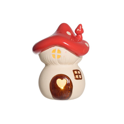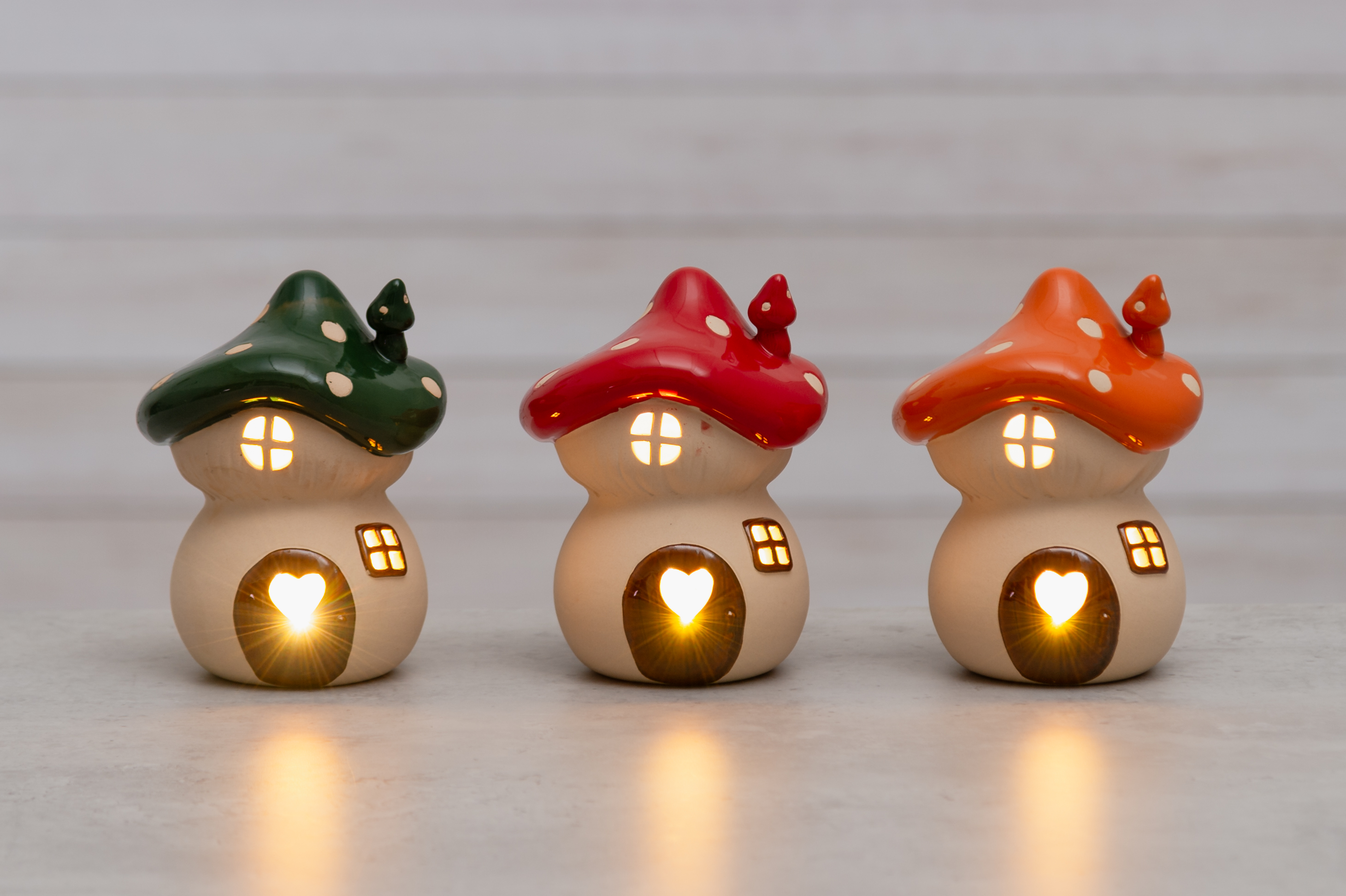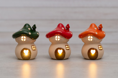 Hauska syksyinen sienimökki, jossa LED-valot. Mökissä on ajastin, joka on 6 h päällä, 18 h pois päältä. Toimii 3 kpl LR44 1,5V -paristolla (sisältyy toimitukseen).