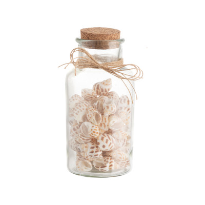 Lasipurkillinen valkoruskeita simpukankuoria, kaunis merellinen sisustusesine.