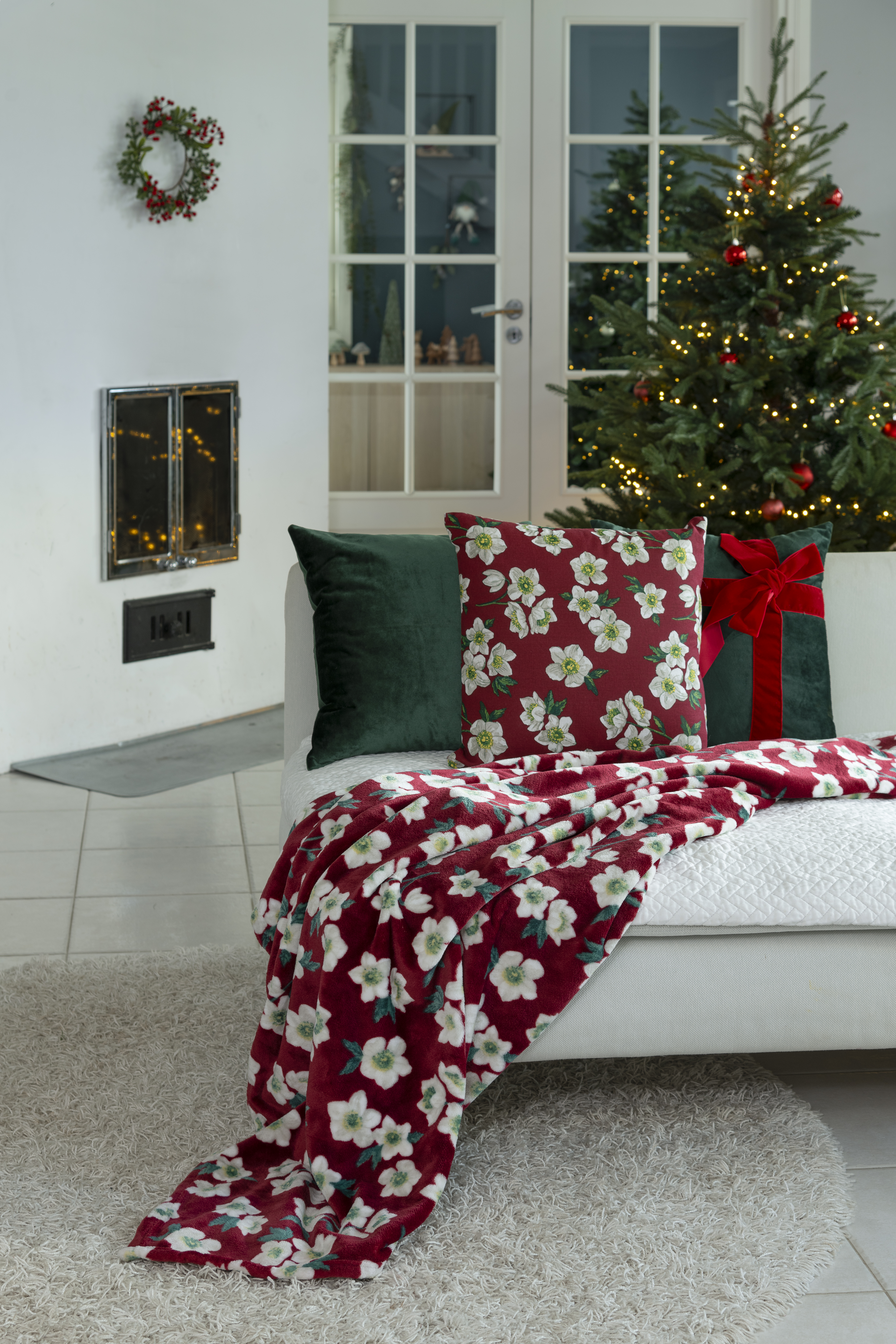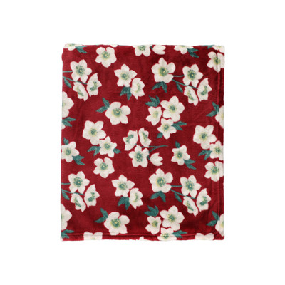 Punainen kukkakuvioinen torkkupeite pehmeästä ja lämpimästä fleecemateriaalista. Vesipesu 40 astetta.